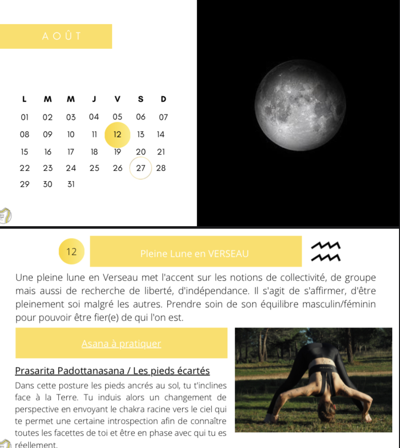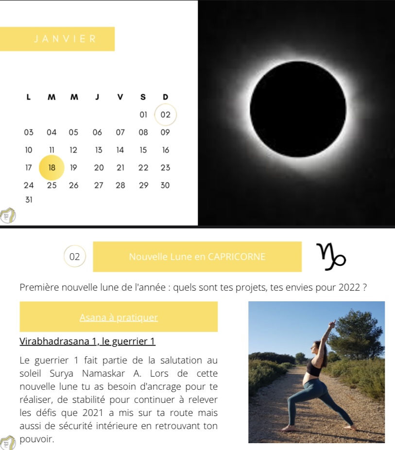 Cette année pour vous accompagner à travers les lunaisons je vous ai préparé un calendrier un peu différent : retrouvez les énergies générales et globales de celles-ci mais aussi des postures de yoga pour vous aider à mieux les ressentir !