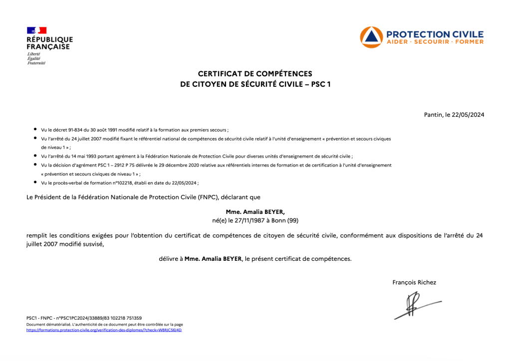 - Avril 2024 : Formation Premier secours (PSC1)